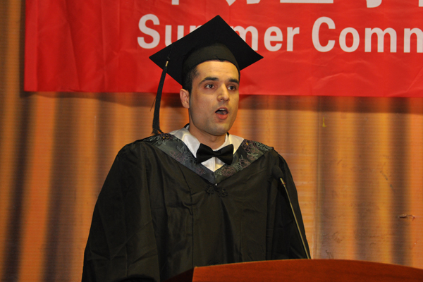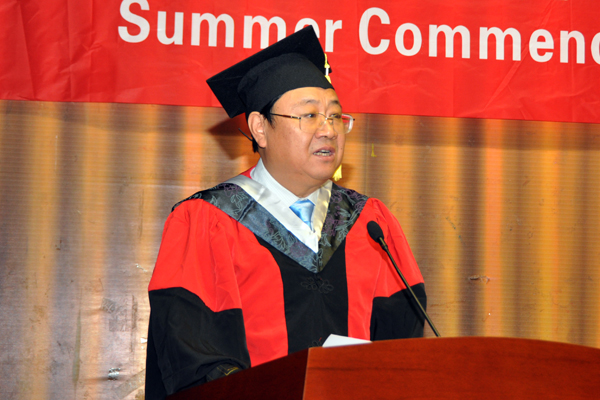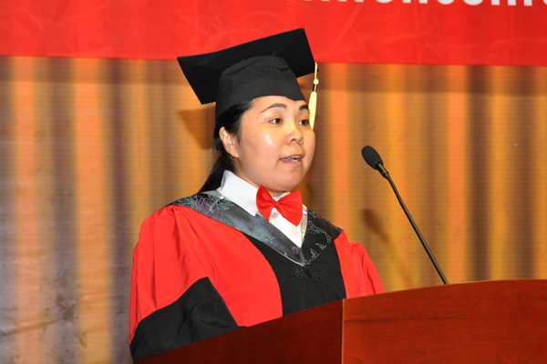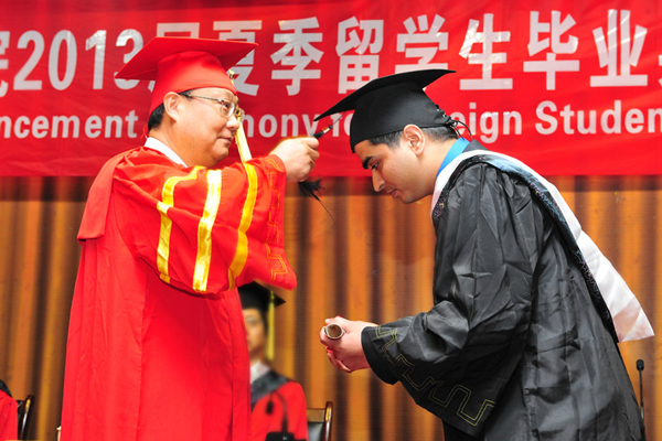 在欢快的音乐声中,马安宁一一为获得学士学位的67名毕业留学生授予学士学位并颁发学位证书。孙宏伟代表学校向圆满完成学业并获得学士学位的留学生表示祝贺,希望留学生们把毕业作为人生新的起点,不断提升自己的知识和技能,锻造优良人格,成为栋梁之才;继续与母校保持联系,关注、支持母校的发展和进步;继续做中外文化交流的使者、传播友谊的桥梁。朱军宣读了《潍坊医学院关于授予2013届留学生学士学位的决定》,葛国文主持典礼。