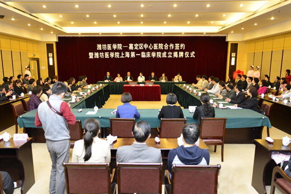 马安宁在讲话中对上海市嘉定区中心医院成为潍坊医学院上海第一临床学院表示热烈祝贺,并向多年来大力支持潍坊医学院发展的各级领导及医院干部职工表示衷心感谢。他向与会人员介绍了学校建设与发展的大好形势,指出设立上海第一临床学院,是学校贯彻落实新医学教育标准和卓越医生教育培养计划,切实提高临床教学质量,建设更多高水平临床教学基地的一次全新尝试,也将为培养更多合格医学人才搭建一个广阔平台。希望学校和医院以此为契机,进一步深化医学教育教学改革,严格教学管理和质量监控,不断提高教育教学质量,既促进医院“医教研”全面发展,又要为学校在改革开放的前沿阵地加强人才培养、促进学生就业打造厚实的平台,为国家医药卫生体制改革和培养高质量的医药卫生事业人才做出更大的贡献。