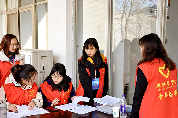 323日,潍坊医学院2019年校园双选会正在浮烟山校区的如火如荼进行着,志愿服务“红马甲”和“蓝胸牌”们成为一道靓丽的校园风景线。