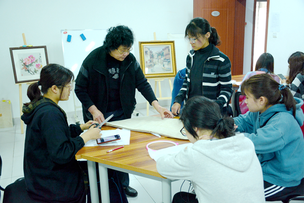 丁老师首先强调:学习刺绣最重要的就是毅力,要学会熬过单调的重复阶段,耐得住心性,巧练苦干结合,慢慢去体会刺绣的精妙之处。随着老师从裁布,画样,针法一点点讲解,学员们慢慢了解到了刺绣的历史。“敢用大红,敢用大绿,色彩鲜明,绣工精细”,丁老师几句话就点明了潍坊刺绣的基本特点。为加深印象,老师特意带来她的两幅作品展示给大家,同学们纷纷围拢过来,看见作品上古雅的小镇和蜿蜒的小溪相映成趣,木质的阁楼感觉纹理历历可数,纷纷被老师精湛的绣艺所折服。轮到自由发言时,同学们大胆提问,踊跃发言。在制作环节,同学们发挥想象,建筑物、动漫、花卉、人物在轻描淡写间,跃然布上。丁老师边讲边看,指导着每一位学员绣线的色彩呈现、粗细长短,不时停下来手把手儿示范,不知不觉就到下课点了,师徒们感觉为“绣”相聚,意犹未尽。