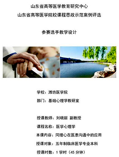 刘晓丽,潍坊医学院心理学院副教授,她讲授的“同理心在医患沟通中的应用”,选题新颖、观点新鲜、互动性强,深受同学们欢迎。在“2020年度山东省高等医学院校课程思政示范案例评选”中荣获一等奖。
