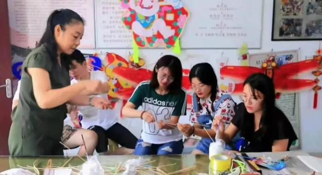 杨老师继续带领大家制作风筝。一弯一穿,双手摆弄着竹条和毛线,用乳胶固定节点,将毛线头和竹条紧紧固定在一起,一个简易却牢固的风筝支架就做好了。杨老师认为,传统文化要继承和发展就要做出一定改变,将传统与传统结合,木版年画和风筝相结合,打造传统文化的新品牌是杨老师的愿望。大家围在杨老师身边,细心倾听她的讲述,角落里的相机就将这一幕固定在了相纸里,也固定在了志愿者们的心里。