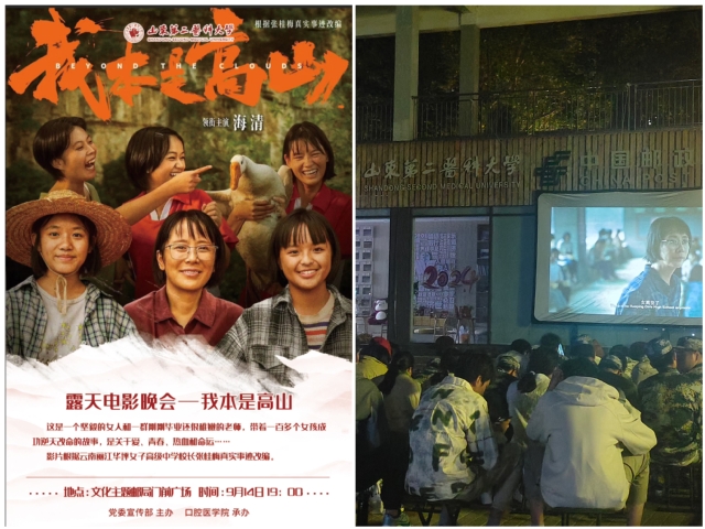 近日,由学校宣传部主办、口腔医学院承办的露天观影活动,在学校文化主题邮局门前广场开展,同学们观看了电影《我本是高山》。