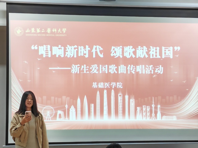 为庆祝中华人民共和国成立75周年,激发广大同学的爱国情怀,推动学院文化建设,10月13日,基础医学院举办“唱响新时代,颂歌献祖国”——新生爱国歌曲传唱活动。学院辅导员、班主任及2024级本科全体新生参加。