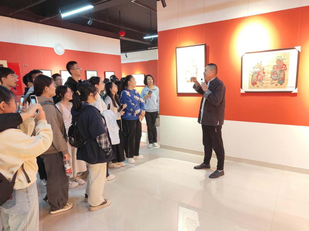 在讲解员的引领下,同学们进入博物馆近距离观看木版年画,了解其中精巧之处,感受年画背后的文化积淀。沿着展厅前行,从早期年画的神话传说,到近代的民间故事,随着时代的发展,年画的内容更加丰富多元,画上的“嫦娥”和“墨子号”栩栩如生,展现了新时代社会主义建设的科技和文化成果。同学们仿佛走进历史长河,领略年画所蕴含的文化内涵与精神力量。馆内复原了传统年画作坊的部分场景,从手工刻版工作台到颜料调配区,都展现着匠人们的智慧与技艺。