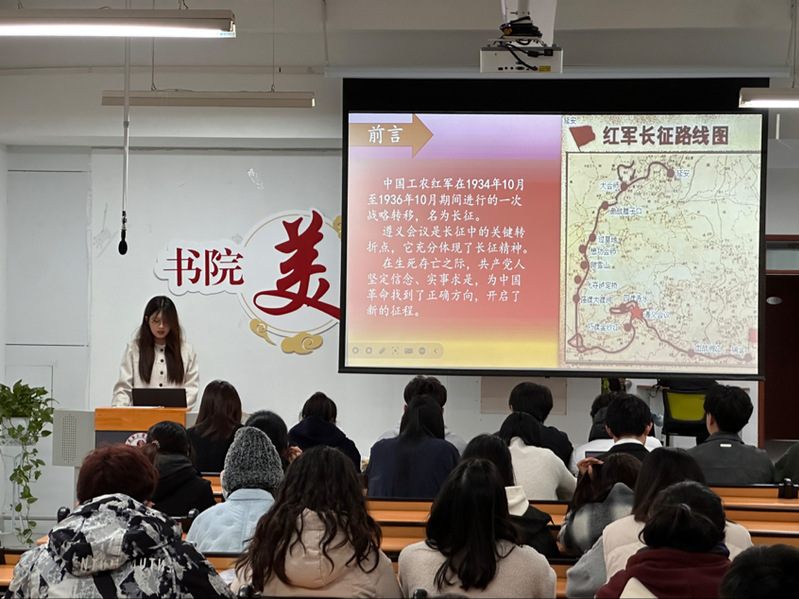 同学们依次登台,用深情并茂的语言讲述红军长征的真实故事,有的讲述红军战士们克服重重困难,勇往直前;有的分享红军战士和人民群众血肉联系,鱼水情深。从雪山草地到激流险滩,从英勇战斗到生死相依,每一个故事都充满力量与感动。同学们的动人讲述不仅充分展示了语言艺术的表现力和感染力,也让现场听众仿佛穿越回那个艰苦卓绝的革命岁月,感受到革命先辈的伟大精神。在每组分享后的问答环节,观众们积极发言,或提出问题,或表达感想,不仅促进了台上台下的交流与共鸣,也加深了大家对长征历史的理解与感悟。