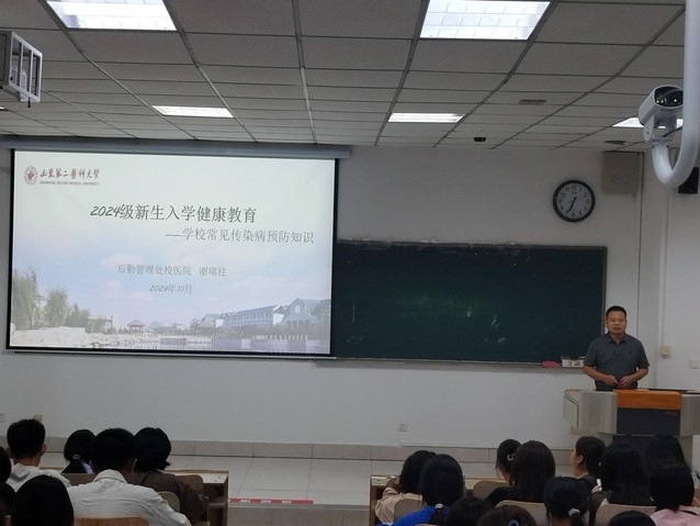 近日,校医院开展健康教育活动向2024级同学为普及疾病预防知识。邀请潍坊市第二人民医院呼吸与危重症医学科五部韩文革主任来校进行学校常见传染病预防知识讲座。