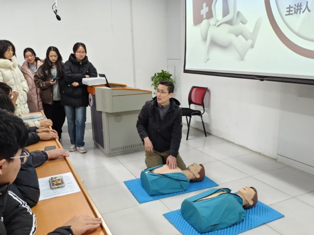 此次医学技能培训内容涵盖了心肺复苏、AED使用、血压测量、夹板固定等多项关键技能,吸引到不同年级学生积极参与其中。在活动现场,杨希营通过理论与实际操作相结合的方式进行讲解,细致入微地为同学们解答疑惑。讲解结束后,针对同学提出的相关疑问,在场培训人员分门别类的给予了专业解答。在随后的实操体验中,同学之间分组互相交流并纠正动作,现场学习热情高涨。