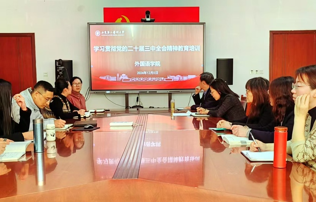 12月5日下午,外国语学院组织开展科级及以下干部、党员学习贯彻党的二十届三中全会精神专题培训,深入理解党的二十届三中全会的核心精神。外国语学院党总支书记张立主持,学院全体教师党员参加。
