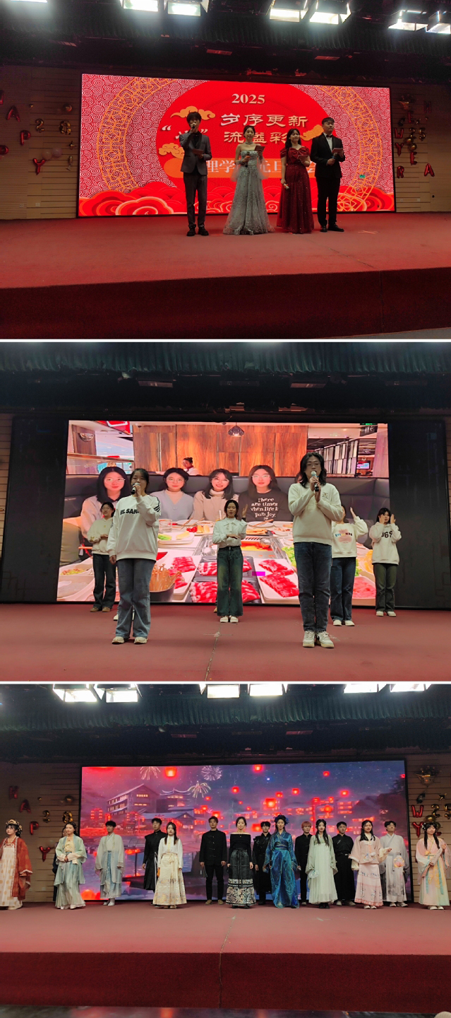 晚会以“岁序更新,‘心’流溢彩”为主题,分为“新元序启·梦起华章”“心韵飞扬·流光溢彩”“逐梦未来·光耀星辰”三个篇章,涵盖朗诵、歌曲、舞蹈、话剧、走秀、情景剧等多种艺术形式,现场气氛热烈,节目精彩纷呈,充分展现出心理学院师生的多才多艺和青春活力。开场朗诵《青春》激情澎湃,诵出青年学子对梦想的执着追求;话剧《站起来了》凭借精彩演绎,重现历史经典场景,激发爱国情怀;歌曲《稻香》、《北京东路的日子》、《身骑白马》、《交换余生》、《向阳而生》或温暖治愈、或深情悠扬,展现音乐独特魅力;舞蹈《born to be》、《dumdi dumdi》、《Gee》、《ditto》活力四射,舞动青春风采;情景剧《奇妙童话夜》创意十足,幽默诙谐,点燃现场氛围;走秀《衣冠上国》、《芭比之夜》热情奔放、活力四射,给同学们带来一场极具冲击力的视觉盛宴,展现青年大学生青春阳光的品质。