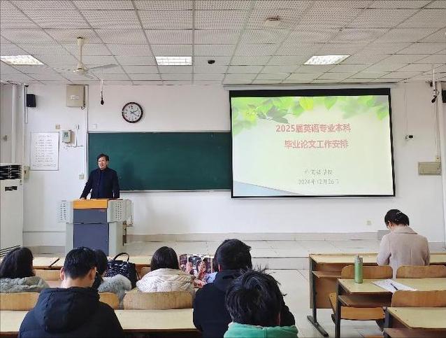 为切实提高毕业论文质量,优化论文管理流程,保障毕业论文工作有条不紊地开展,近日,外国语学院组织召开了2025届英语专业本科生毕业论文工作部署会。外国语学院院长付有龙、全体毕业论文指导教师以及2021级英语专业学生参会。