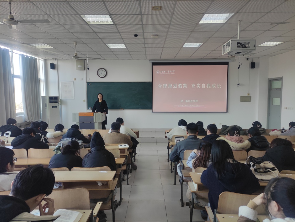 为增强同学们的安全意识,让同学们度过愉快充实的假期,1月6日,第一临床医学院开展“合理规划假期 充实自我成长”主题班会,党委副书记朱红主讲,辅导员和全体学生参会。