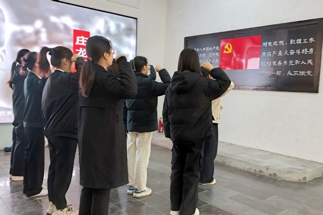 讲解员介绍了烈士陵园的历史沿革及烈士们的英雄事迹,在庄重的氛围中,党员们面对党旗,共同高举右拳,庄严宣誓。誓言铿锵有力,提醒着每一位党员要牢记初心使命,继承先烈遗志、为共产主义事业奋斗的坚定决心。