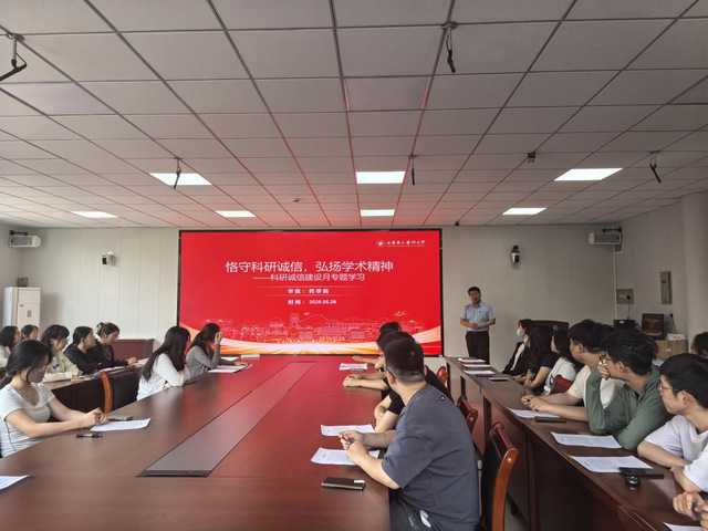 5月26日下午,药学院举行科研诚信建设月专题学习会,学院副院长周进、辅导员与2024级全体研究生齐聚一堂,共同推进科研诚信建设。