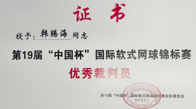5月20至27日,第19届“中国杯”国际软式网球锦标赛在中国台州市举行,bw基础医学院教师、软式网球国际级裁判员韩腾海受邀执裁男子单打、男子双打、混合双打三场决赛比赛,并荣获“优秀裁判员”称号。
