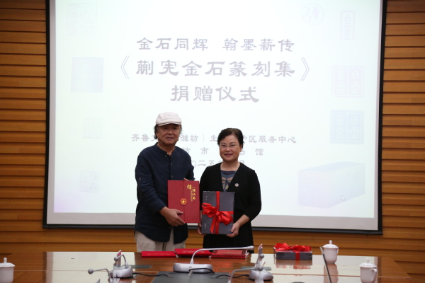 9月19日,金石同辉·翰墨薪传--《蒯宪金石篆刻集》捐赠仪式在潍坊市图书馆举办,著名书法家、篆刻家蒯宪先生向bw图书馆捐赠《蒯宪金石篆刻集》,bw图书馆馆长李向云接收捐赠。