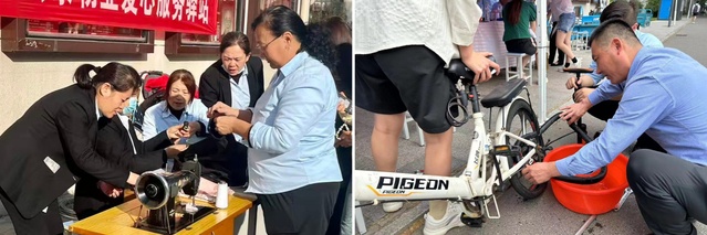 活动当天,同学们陆续带着需要修补的衣物来到现场。阿姨们飞针走线、精心缝补,每一针都传递着浓浓的关爱;一辆辆“生病”的自行车被推到维修点,师傅们认真检查故障原因,专注地投入到维修工作中。