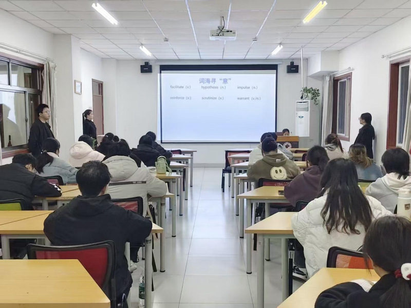 本次挑战赛采用“线上打卡进阶线下决赛争锋”的阶梯式赛制层层递进夯实学习效果。初赛阶段,参赛学生需连续15天完成每日不少于40个单词的打卡任务通过持续积累筑牢四级词汇基础。决赛分为两个环节“单词检验”环节通过PPT现场出题,重点考查学生对四级核心词汇的释义理解与快速应答能力团队抢答环节围绕英文选义、中文选词展开比拼,既检验词汇积累水平考验选手的反应速度与团队协作能力。比赛现场气氛紧张热烈,选手沉着应对、配合默契,展现出扎实的英语功底良好的竞技风貌。