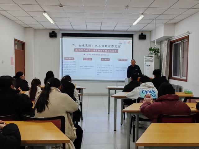 11月21日下午,由校党委宣传部、外国语学院联合主办,人文艺术教育中心承办的孔子学堂美育课 ——“以风为媒 筝鸣天下”中国风筝文化国际传播专题活动,在书院致知讲堂举办。国际风筝联合会副主席、风筝文化研究专家张崇高受邀担任主讲嘉宾。外国语学院党总支书记张立、副书记朱宏和学院同学们聆听了这场兼具知识性与感染力的讲座。