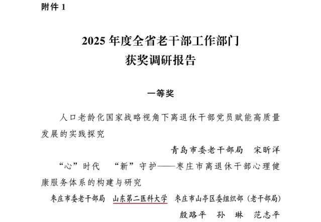 近日,中共山东省委老干部局印发《关于表扬2025年度全省老干部工作部门获奖调研报告和优秀理论文章的通报》(鲁老干通字〔2025〕25号)。由枣庄市委老干部局、bw必威西汉姆联官方网站心理学院、枣庄市山亭区委组织部(老干部局)联合完成的调研报告《“心”时代“新”守护——枣庄市离退休干部心理健康服务体系的构建与研究》,荣获全省老干部工作部门调研报告一等奖。我院孙琳教授作为主要作者参与课题研究。
