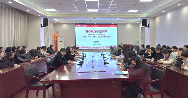 近日,基础医学院召开“凝心聚力・共促升学”“学院-导师-学生”三级联动考博动员会。学院党委书记楚新艳主持活动,党委副书记李晓双、副院长陈燕春、2023级研究生导师和学生代表参会。
