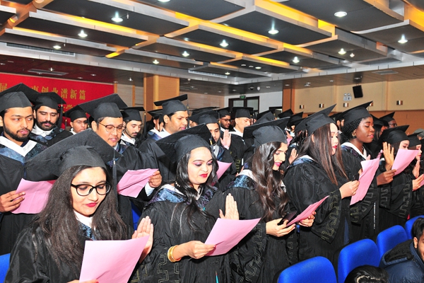 Prof. Sun Hongwei spoke at the ceremony and congratulated the international students who successfully completed their studies andexpressed his gratitude to the teachers who worked hard for the education ofinternational students. Prof. Liu Jun read the Decision on Granting a Bachelor Degree for 2018 Winter International Students.