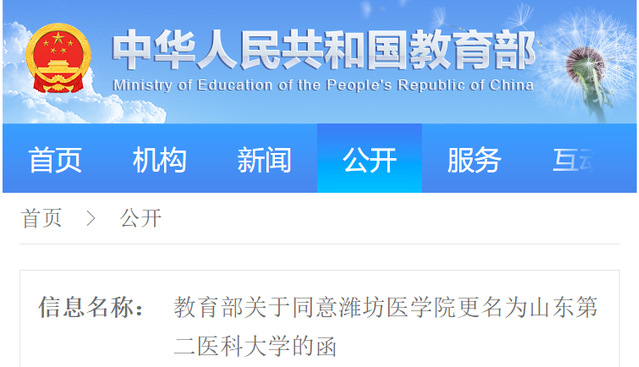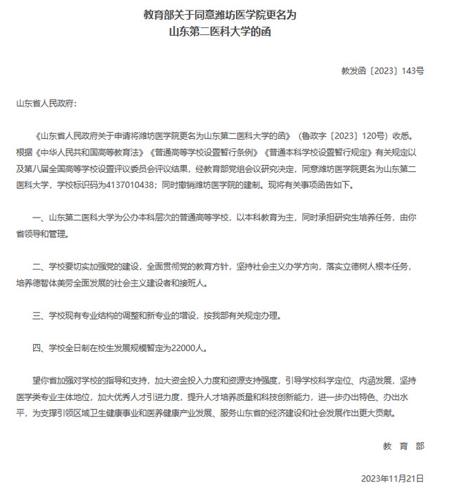 | Official Announcement: MOE Approves Weifang Medical University Renamed Shandong Second Medical University |